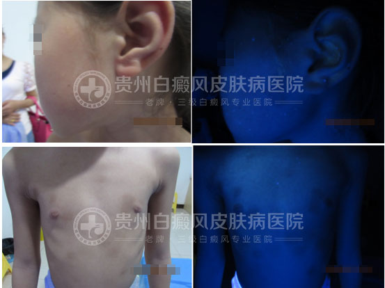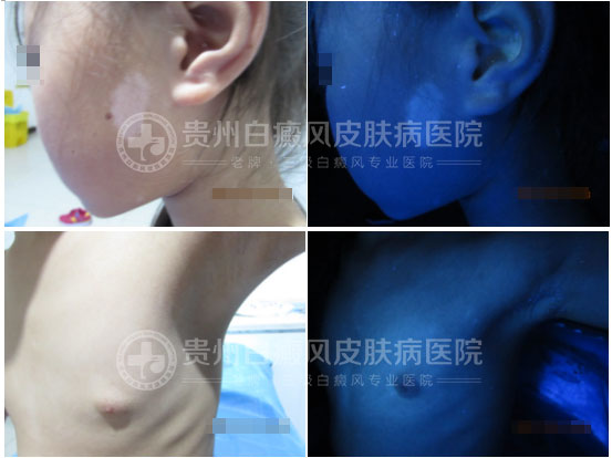 苏同学的白斑是于来院前两个月发现的,发现时只有左面部有白斑,后来逐渐扩大、扩散至左下颌及前胸。患者家属告知曾带孩子到遵义某医院治疗,诊断为“白癜风”,给予口服药、外用药(地奈德乳膏)治疗20天效果不佳,白斑反而增多,后在网络上了解到贵州白癜风皮肤病医院前来就诊。