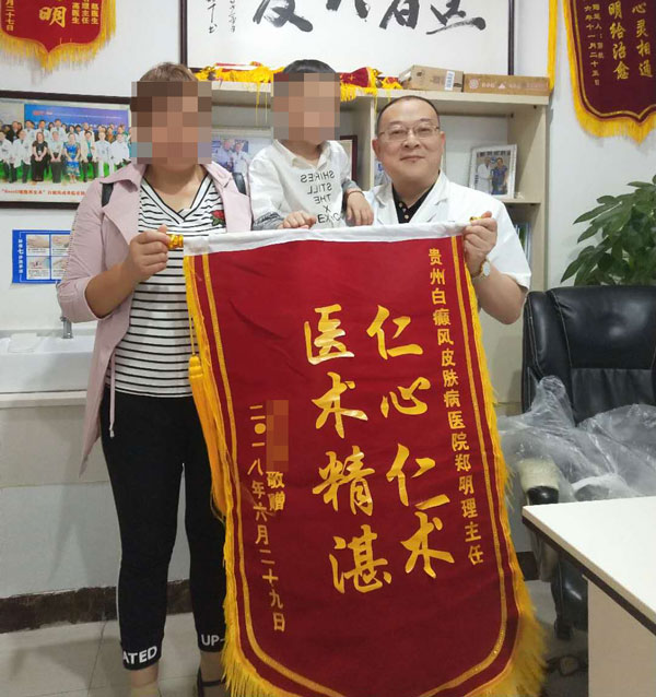 预约挂号:0851-85766590 贵阳市南明区沙冲南路87号 分型论治中西结合环境舒适假日无休 一面锦旗一个故事,近日贵州白癜风皮肤病医院郑明理主任诊室再获锦旗。患者朱朱(化名)在其家长的带领下将一面印有“仁心仁术,医术精湛”的锦旗送到郑明理主任的手中,以表达主任这段时间精心的治疗及对细心的照料。 了解白癜风治疗可通过以下方式: 预约挂号热线电话白斑自测