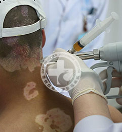 利用治疗设备尖端特制的传感器,在影像系统引导下,将黑色素营养细胞药物注射到皮肤基底层,也就是黑色素细胞存在的皮肤层,促进黑色素细胞内黑色素。