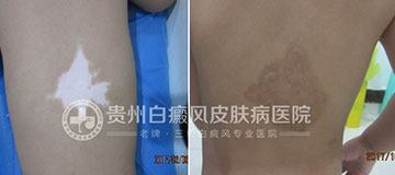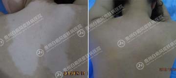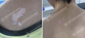 基本信息 姓名:李惠惠(化名) 性别: 女 年龄:3 住址:毕节 主诉:后背白斑1年。 ▲ 治疗前后对比图 既往史:无药物过敏史,无手术外伤史,无其他慢性病史。 家族史:无类似病史。 个人史:偏食、挑食,余无特殊。 患者父母于一年前发现孩子后背出现白斑,