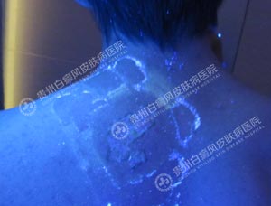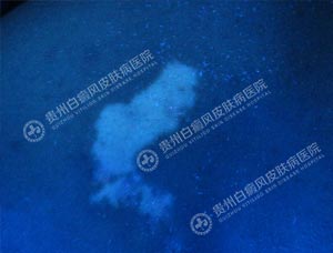 4、wood灯:背部有不同程度脱失性白斑。