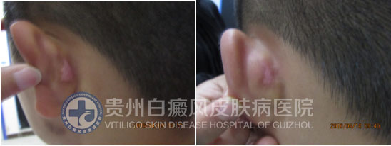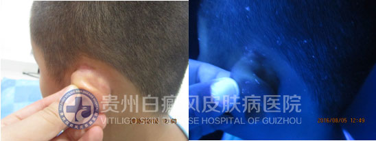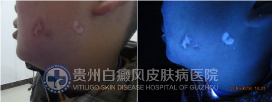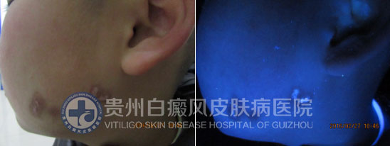 病史:患者治疗前7个月左右左面颊出现黄豆大小白斑,境界不清,逐渐扩大,扩散至耳后。近2个月加重,白斑扩大。曾在“黔南某医院”诊断为“白癜风”,给予中药煎服及外用药涂擦(医院自配)后效果不佳,遂来我院就诊。