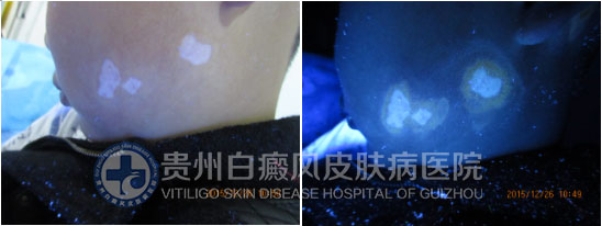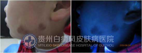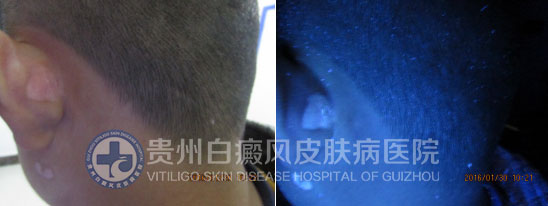 Wood灯下:左面颊、耳后显示亮蓝白色斑片,白斑部位及周围皮肤附着棕黄色药物(外用药所致),色素脱失程度60%-80%不等。