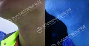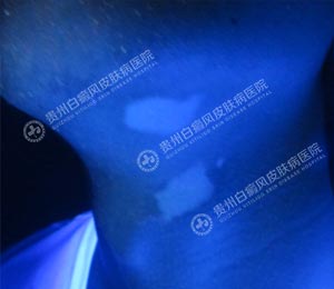 4、wood灯:颈部均有不同程度脱失性白斑。