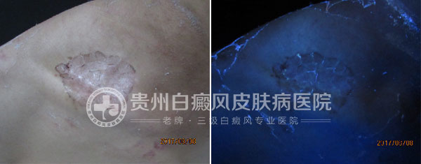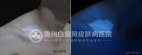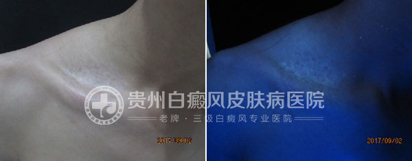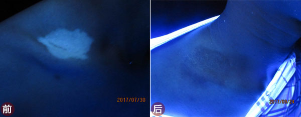 为了加速患处黑色素细胞生成,郑主任又为患者进行308光疗+内服药物巩固治疗,一个月后患者肩部白斑基本祛除,医生提醒患者定期复诊及治疗。