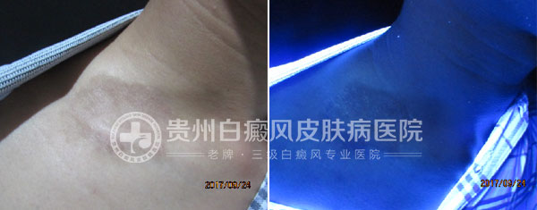 患者林先生于2014年6月发现右锁骨窝部位不明诱因的出现白斑,当时觉得白斑不大,对白癜风也没有足够的认识,就对该白斑置之不理。然而三年来白斑不断变大,这才重视起来。10多天前在网络搜索得知这白斑可能是白癜风,便到当地医院接受梅花针治疗。为了进一步治疗白斑,在网上提前预约了我院郑明理医生,第二天便前来治疗。