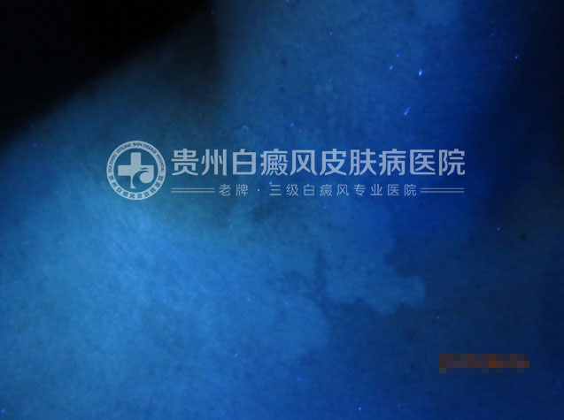白癜风智能AI成像检测系统:见蓝白色光斑,边界清,脱失程度50%——70%不等。