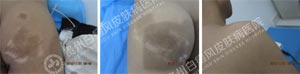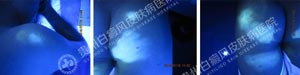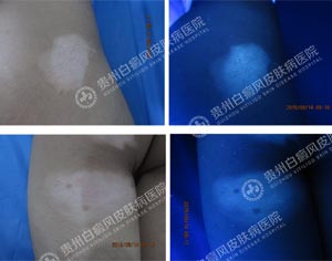 Wood灯:右肩胛、臀部点片状白斑,边界不清。wood 灯下显示亮蓝白色斑片,色素脱失程度70%-85%不等。(详见图)