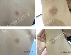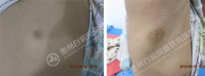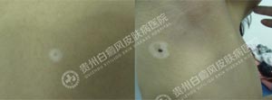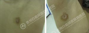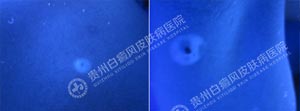 Wood灯:后背、腋下痣呈向心型白色斑片,显示亮蓝白色斑片,边界不清晰,色素脱失程度为80% 。