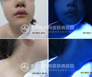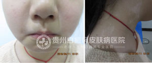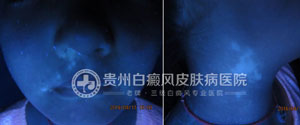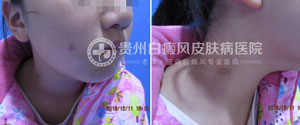 事情还要追溯到去年春天,小小年纪的彤彤不知为何诱因右颈部突然出现指甲大小的白斑,境界模糊不清,不到半年的时间扩大到碗口大小,甚至扩散到鼻翼下、右嘴角。看着活泼的彤彤被白斑折磨的郁郁寡欢,彤彤外公带着她到贵阳市一家综合性儿童医院治疗,医院诊断孩子的白斑实乃白癜风,并给予“他克莫司软膏”外涂及口服药治疗,治疗了几个月白斑仍没有好转。后来彤彤外公打听到贵州白癜风皮肤病医院是一家专门白癜风的专科医院,于是带着彤彤前来治疗。