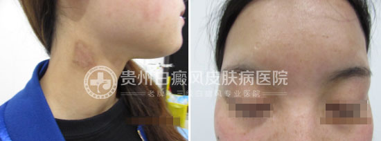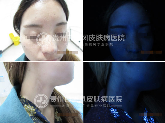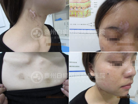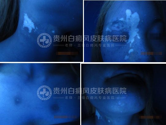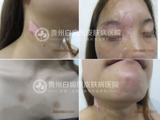 患者于一年多前右眼周围莫名出现钱币大小的白斑,境界不清,在贵阳某皮肤病医院诊断为白癜风,给予了针剂、口服药、外用药等方法治疗,但是效果不佳,白斑逐渐扩大,并扩散至面颈部及前胸,后经网络查询来到我院就诊。