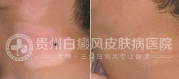 【患者病历】 基本信息 :刘同学,男,17岁,贵州毕节人 症状表现 :颈部大块白斑,中间有颗痣(晕痣) 既往史: 无肝肾功能异常,无传染病史、无手术史,有外伤史,有同形反应 检查: 1、智能AI成像检测系统:颈部大面积片状白斑,白斑中间有颗痣(晕痣),边界