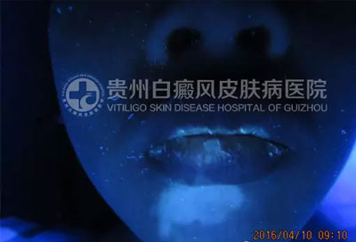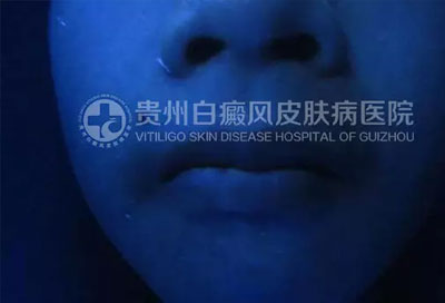 Wood灯下:右下颏显示亮蓝白色斑片,色素脱失程度60%~70 %不等。