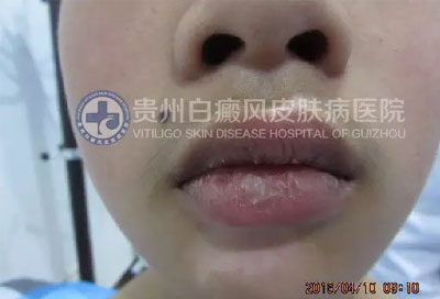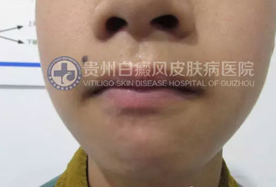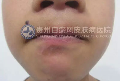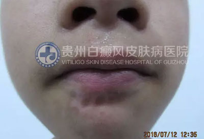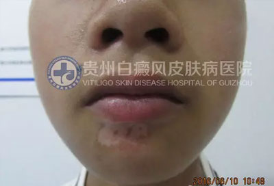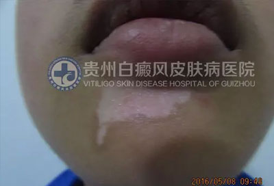 现病史:患者半个月前右下颏出现白斑,境界不清,逐渐扩大。曾在“织金县人民医院”诊断为“白癜风”,给予“甘草酸二铵肠溶胶囊”、“复合维生素B片”口服,“曲安奈德益康唑乳膏”外涂一周无效,白斑扩大。遂来我院就诊。