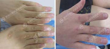 患者基本资料 姓名:邓翠翠(化名) 性别:女 年龄:39 住址:六盘水 主诉:双手指背腕白斑20年 既往史: 既往健康,无特殊病史,否认传染病及药物过敏史。 家族史:否认遗传及类似白斑病史。 个人史:无特殊。 不幸始于20年前的一天,由于邓女士一次不小心使