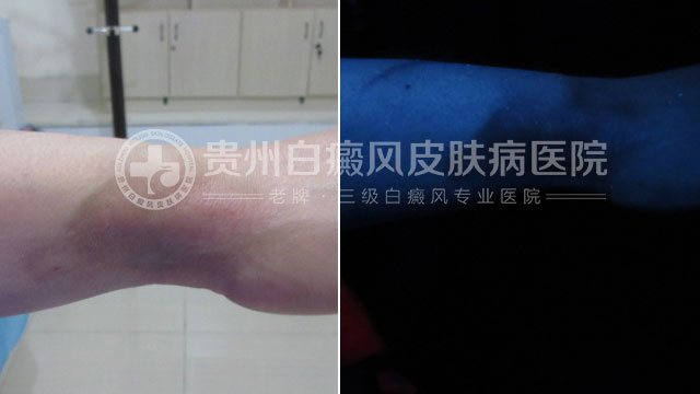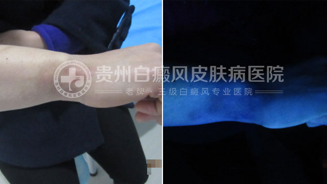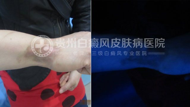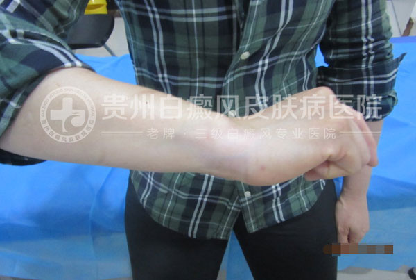 患者复查肝功能正常后,医生为其采用内服药+308nm准分子光综合治疗,经过几个疗程的治疗,患者手腕处白斑祛除▼