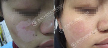 患者基本资料 姓名: 罗某 性别:男 年龄:20 主诉 :右面部白斑6年。 既往史 : 既往健康,无特殊病史,否认传染病及药物过敏史。 家族史 :否认遗传及类似白斑病史。 个人史: 建筑工地上班,经常暴晒,余无特殊。 患者治疗前后面部对比 患者6年前右鼻翼旁