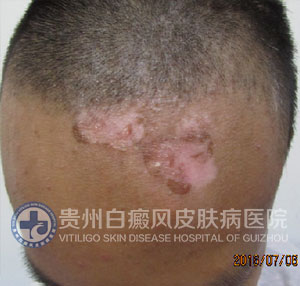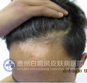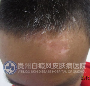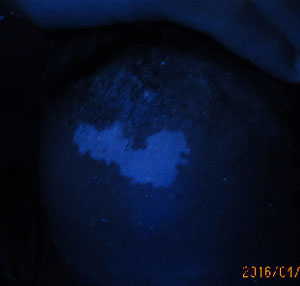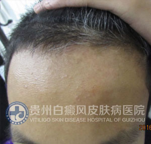 Wood灯:左前额发际出现4*3cm大小不等、形态各异白斑,部分融合成片,边界不清,上无鳞屑。wood 灯下显示亮蓝白色斑片,色素脱失程度60%-85%不等。(详见图)