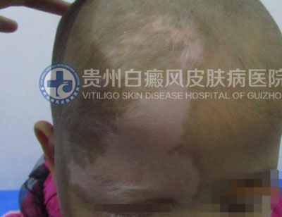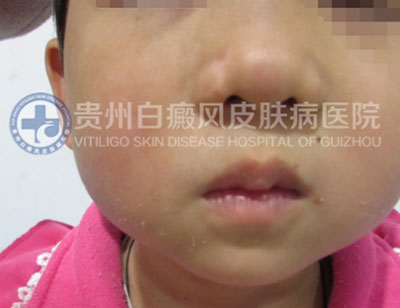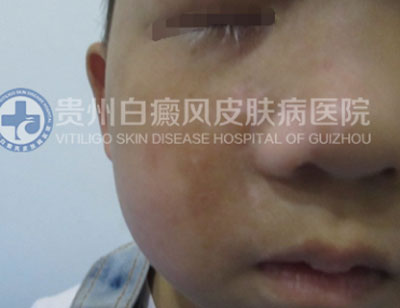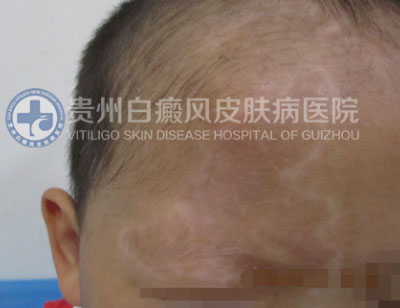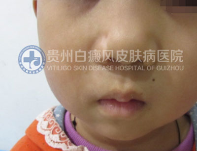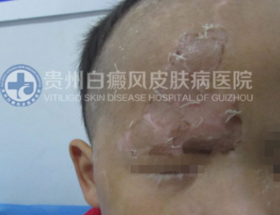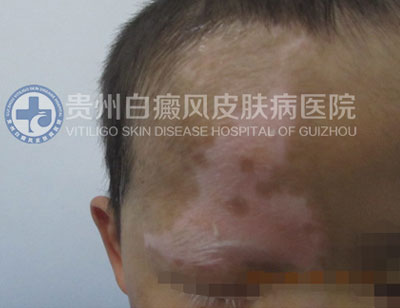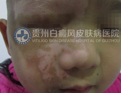 现病史:患儿3年前右眼内眦出现黄豆大小白斑,境界不清,逐渐扩大,扩散至前额、右眼周、鼻翼、右鼻唇沟、右面颊、后颈、右耳后、后背。曾在医院诊断为“白癜风”,给予针剂、口服药、外用药(药物不详)及物理治疗前后近3年效果不佳,近1年病情加重,白斑扩散,遂来我院就诊。