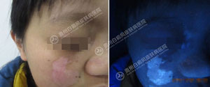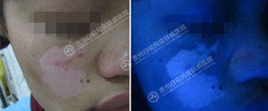 ▼第一个疗程:内服药物+308nm准分子光+磁波塌渍稳定病情,治疗后明显可见患者面部白斑面积减小,边缘清晰可见,病情趋于稳定。