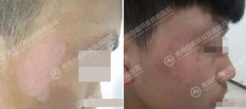 【病案信息】 姓名 :齐锋(化名) 性别:男 年龄: 17 住址:普定县 主诉 :右颞部白斑3个月。 既往史 :既往健康,无药物过敏史。 家族史 :无遗传及类似白斑病史。 【诊治记录】 检查: 微量元素:铜离子↓ 微循环:中度异常 血常规: 正常 免疫五项:正