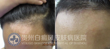 患者基本信息 姓名:林敏(化名) 性别: 女 年龄:42 住址:黔西 主诉:右侧头皮白斑6个月▼ 既往史:既往患“慢性肾炎”、“胃炎”、“胆结石”均已治愈,否认传染病及药物过敏史。 家族史:否认遗传及类似白斑病史。 患者6个月前右侧头皮出现钱币大小的白斑