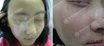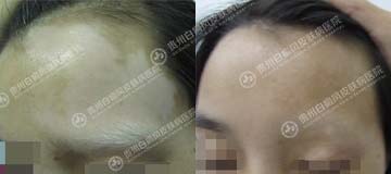 【病案信息】 姓名: 王艳(化名)性别:女 年龄:18岁 住址:遵义 主诉: 左眉弓白斑一年半 既往史 :既往健康,无药物过敏史 家族史 :无遗传及类似白斑病史 【诊治记录】 微量元素:铜离子↓ 微循环:中度异常 免疫五项:正常范围 血常规:正常 Wood灯:左