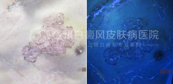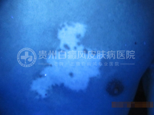 检查:白癜风智能AI下:左前胸、左腋下、左手指背显示亮蓝白色斑片,色素脱失程度不等;下腹部、双下肢显示绿豆大小散在淡蓝色斑点。