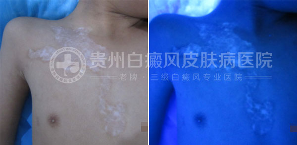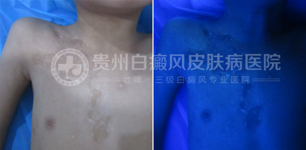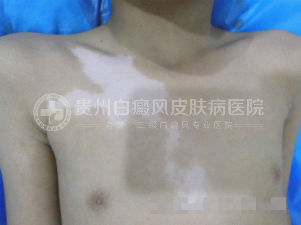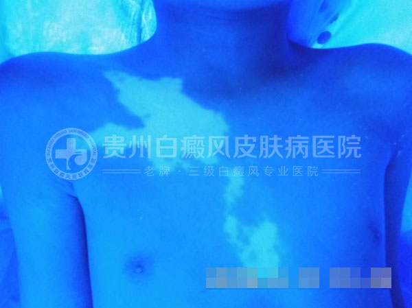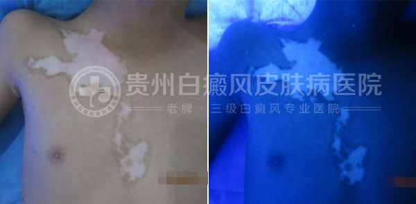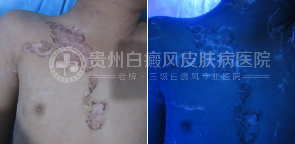 现病史: 2年前胸部出现白斑,曾于贵阳某医院治疗(具体不详),范围扩大,双上眼睑脱屑,偶痒,遂来我院治疗。