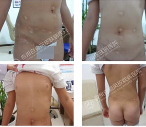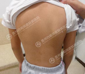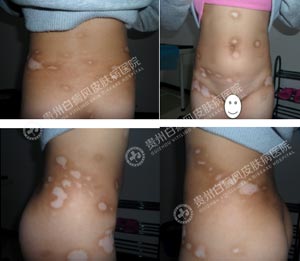 检查:1.wood灯检查 腋下、腹股沟、背部、脚部花瓣状白斑,眉弓、嘴唇黑色素轻度脱失。