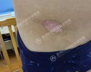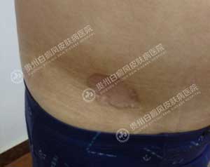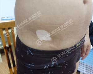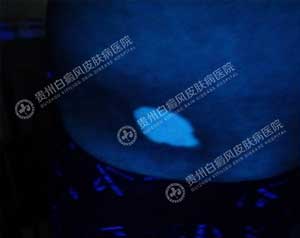 专科检查:伍德灯检查见嘴唇,胸前, 后背见散在隐性白斑。