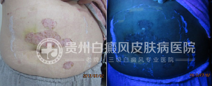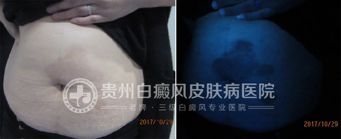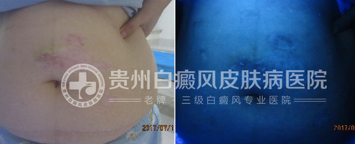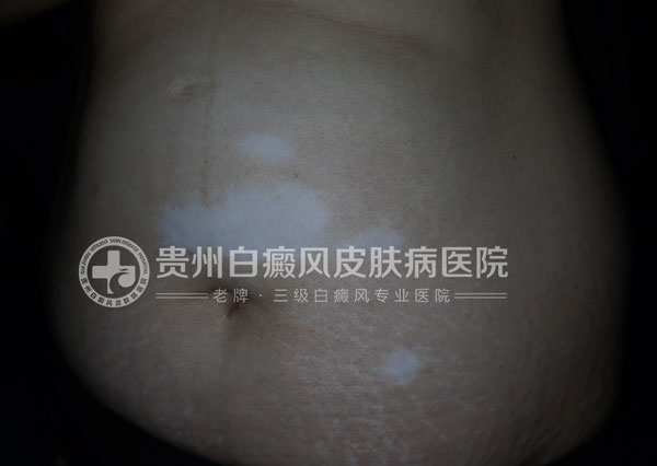 患者林女士10年前一次外伤导致腹部出现白斑,当时未引起重视,也没有给予任何手段去治疗,几年里也未见白斑有任何扩大的迹象。然而近两年,林女士发现腹部的白斑在慢慢扩散,在网上搜索才发觉可能是白癜风。由于患者家住贵阳对我院有一定了解,第二天便预约了我院李主任前来治疗。