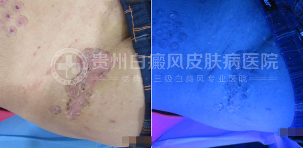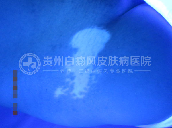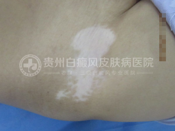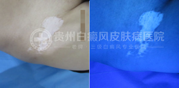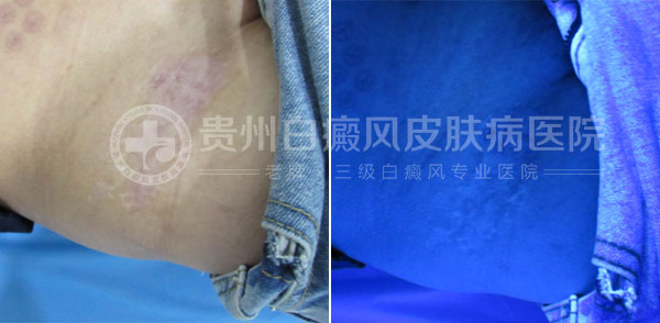 现病史:患者6年前右髂脊出现钱币大小白斑,境界不清,逐渐扩大。近半年双上眼睑出现钱币大小白斑。曾在黔西某医院、福州某医院诊断为“白癜风”,给予口服药、外用药治疗后效果不佳,后来我院就诊。