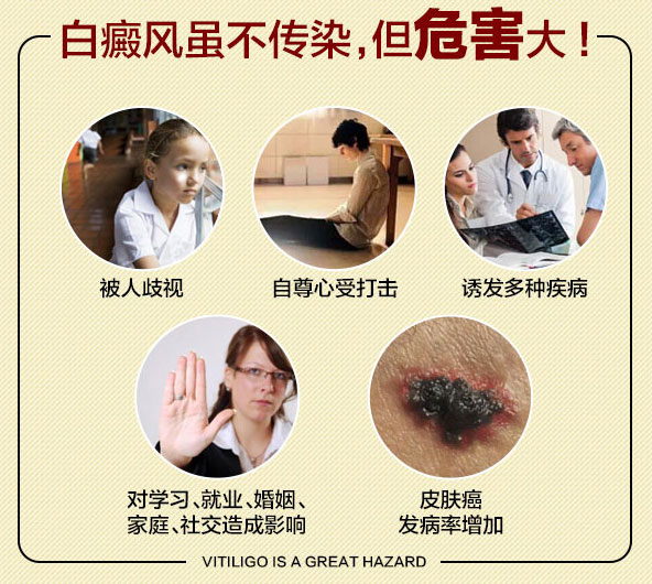 男性群体在社会上的生活压力是比较大的,很多女孩子喜欢选择外貌较好的男生做为自己的另一半,而白斑极大的影响了男性的外貌,使得这部分男性失去了优势,斑驳的外表终究使得这部分男性群体在职场中不占优势,事业上受到影响,继而对婚姻产生影响,危害家庭幸福。久而久之,会对身体和心理产生双重打击。
