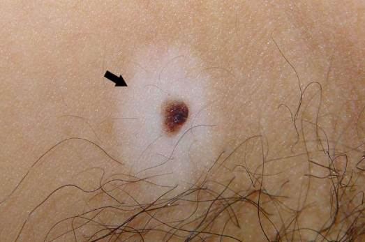 2.皮损为在黑素细胞痣周围绕以圈状脱色区或晕,有时也会出现炎症的发生,主要的表现就是红斑或结痂,通常情况下经过数月之后也是可以自行消失的。