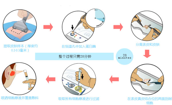 recell自体体外细胞再生术取代实验室,不需要专门的实验人员,由术者在手术室完成;获得与治疗区域相匹配的细胞悬液,可以治疗大面积白癜风患者;不需要培养,没有伦理问题,可以在临床大范围推广;整个治疗过程一小时左右完成。