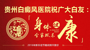 2016年猴年春节在即,贵州白癜风皮肤病医院全体员工在此祝您在新的一年: 经济轻松解套,事业成功上道, 感情甜蜜牢靠,家庭和睦热闹, 生活幸福美妙,日子福星高照。 衷心祝您及家人身体健康,阖家欢乐! 目前,贵州白癜风皮肤病医院春节假期门诊安排工作已