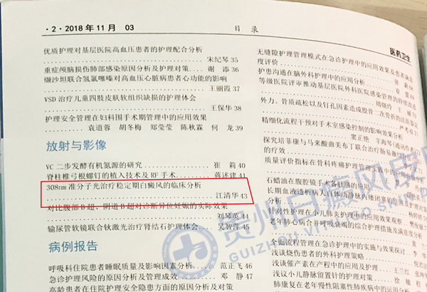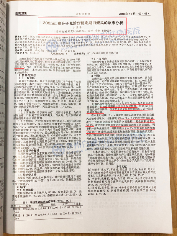 分型论治中西结合环境舒适假日无休近日,学术期刊《医药卫生》(2018年11月03)正式发布,贵州白癜风皮肤病医院江清华主任联名撰写的论文《308nm准分子光治疗稳定期白癜风的临床分析》成功荣登该期刊。不仅是对个人学术能力的肯定,还意味着308nm准分子紫外光皮肤治疗仪(GSD308)将在白癜风领域有更加科学的、普及和推广应用。